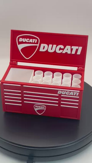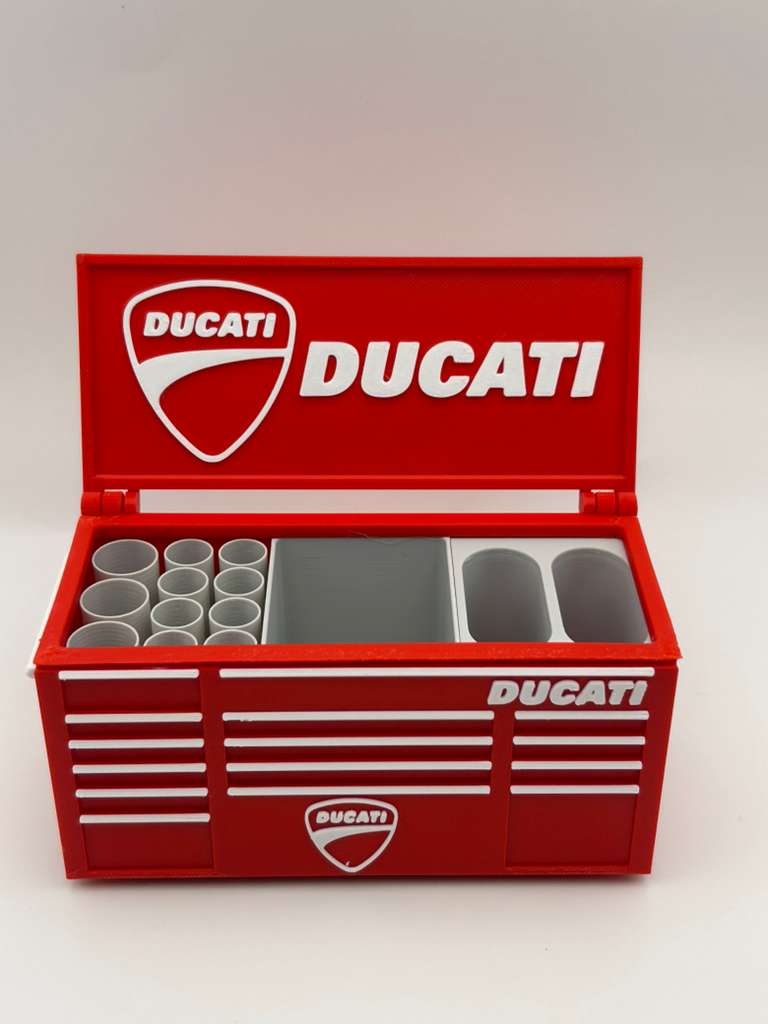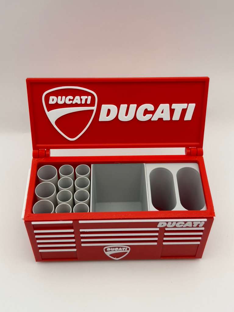 Bring bold motorcycle attitude to your workspace with this handcrafted 3D-printed red toolbox pen holder.